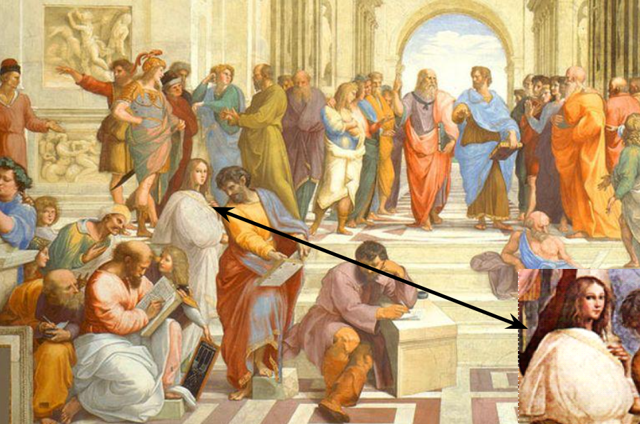 Hypatia, as popularly conceived, may be likened to a celebrity figure in a Madame Tussauds Museum diorama. Five hundred years ago, the painter Raphael did not intend the person highlighted in Figure 1 to represent Hypatia of Alexandria, rather it is likely a portrait of one of the artist’s lovers. Modern eyes however made a connection with Hypatia because the painting encapsulates aspects of her legend perfectly. We see the character placed among notable philosophers, scientists and luminaries associated with the ancient School of Athens, with Plato and Aristotle figured prominently. This reinforces Hypatia’s reputation as a Neo-Platonist philosopher. Perhaps more importantly it provides pictorial “proof” she was young, beautiful, and of Greek, hence European, extraction.
