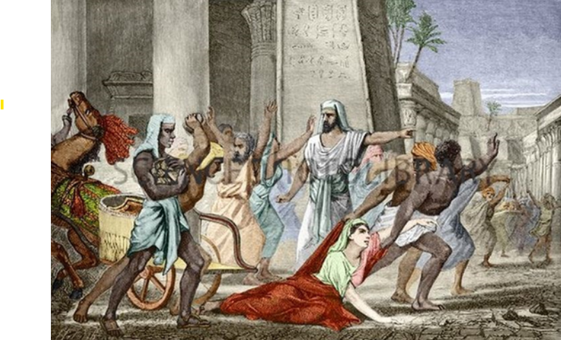 This picture by Louis Figuier shows a central Pharisee-like figure directing black slaves to take Hypatia to a place of execution, while one impatient member of the crowd already is in the act of stoning her. The setting is a mish-mash of Egyptian and Greek architecture, including faux hieroglyphics on a backdrop wall and is laden with social assumptions of its time.